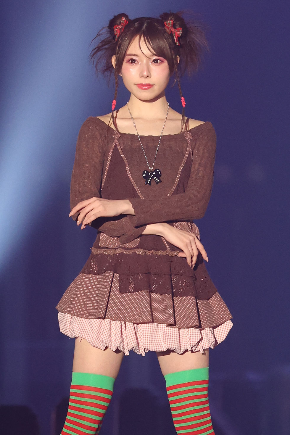 ブルーリボンを編み込んだヘアスタイルに、チュール素材のブラックリボンを合わせた個性的なスタイリングを披露。ホワイトトップスにブルーの襟を合わせた衣装と、星柄のチェック柄スカートで爽やかさと遊び心を表現した。
